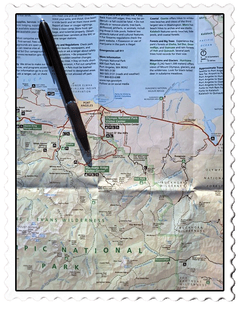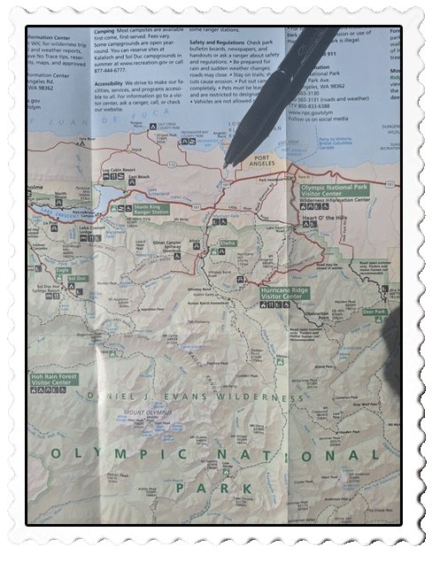 Cousin Bruce drove us north on State Highway 101 for two and a half hours, with our western horizon conifer-covered by the huge, 922,651-acre Olympic National Park, a splendid resource we intended to camp near and explore over the next five days.