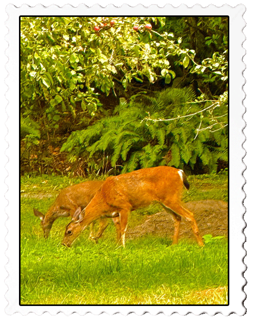 A doe and two fawns, along with two other black-tailed deer, gave us company each evening.
