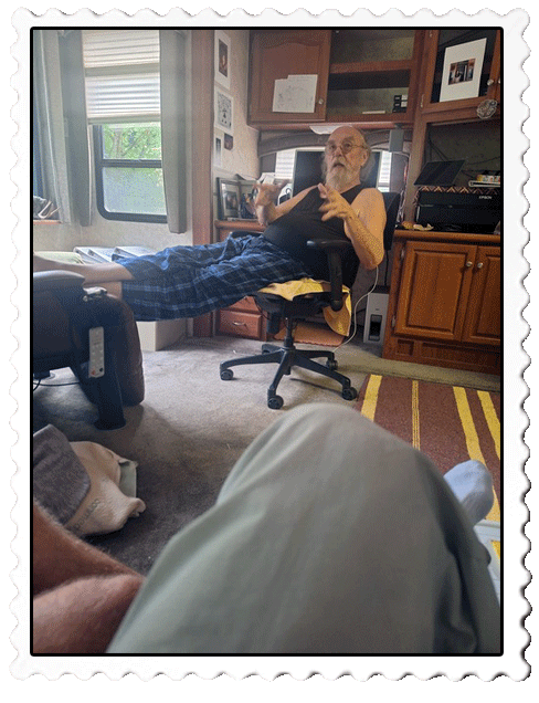 Our evening routine became quite enjoyable as Jerry would invite us to join him in his trailer for a bull session and maybe a movie before bedtime. It turned into a trip highlight as we learned of Jerry’s travels all over Southeast Asia, living in Thailand, his experiences operating a salmon troller 50 miles off the coast of Alaska, his flourishing business importing fabric from India, Asia, and Vietnam, and his oak, maple, coastal redwood, and sequoia planting experiment on the land we were camping on.