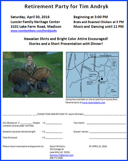 Tim Andryk retired in January of 2016 after completing a 29 year career. Starting in Wildlife Management, Tim worked with the Bureau's planning, budget and personnel issues. He moved to the Legal Section where he represented Fish, Wildlife, and Stewardship for 24 years. For the last 4 years he was the Chief Legal Counsel for WDNR. For the next several months he will be helping family move, will ski in his second Birkebeiner, looks forward to more hunting and fishing and already says, "State retirement is a GOOD deal"!!!
